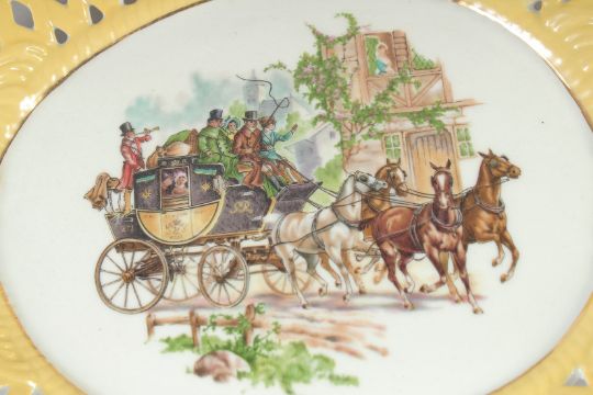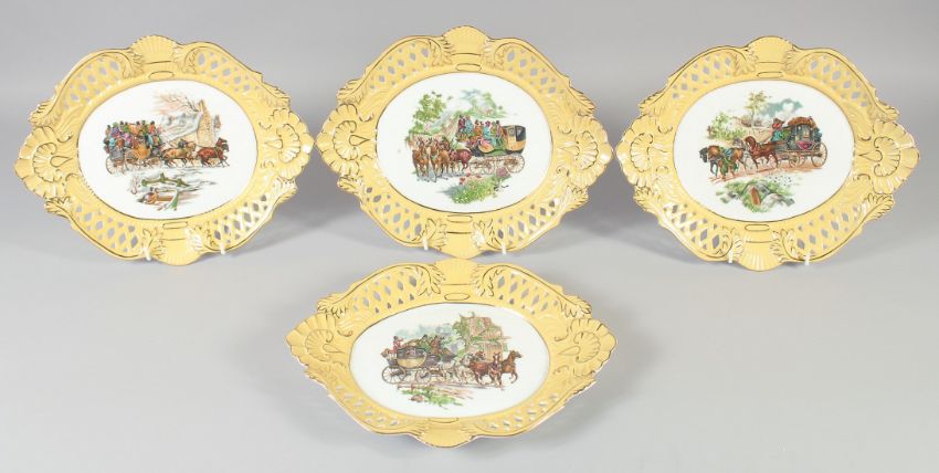 A SET OF FOUR CONTINENTAL YELLOW GROUND OVAL STAGECOACH DISHES.