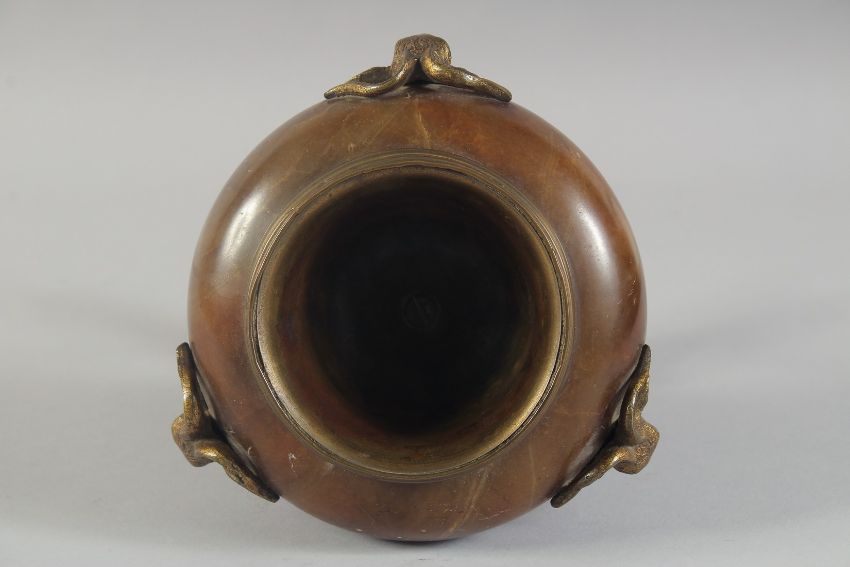 A REGENCY ONYX BOWL with bronze rams heads on a tripod base.