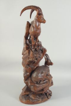 A SUPERB BLACK FOREST CARVING OF A PAIR OF MOUNTAIN GOATS one standing, the other seated on a rock (2)