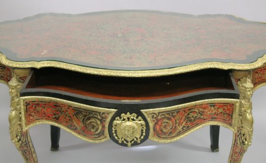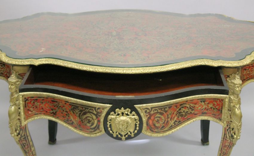 A SUPERB VICTORIAN BOULLE OVAL CENTRAL TABLE with brass inlay on tortoiseshell, fitted with a long drawer, ormolu mounts, masks and curving legs.