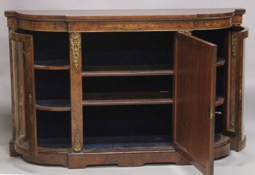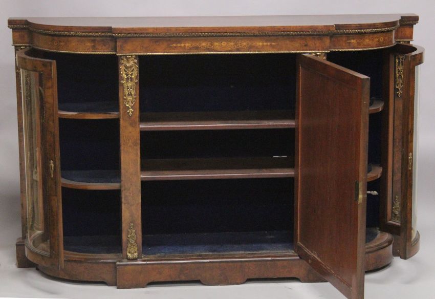 A GOOD VICTORIAN WALNUT AND MARQUETRY CREDENZA by EDWARD & ROBERTS with figured walnut top, ormolu mounts. The front with panelled walnut centre door flanked by bow fronted glass doors.