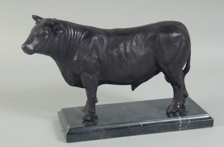 A BRONZE BULL on a marble base.