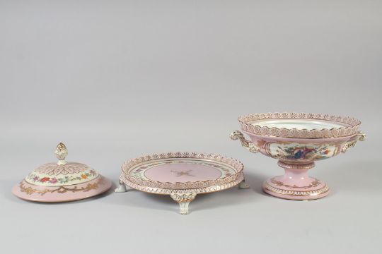 A CONTINENTAL PINK PORCELAIN CIRCULAR TUREEN, COVER AND STAND.