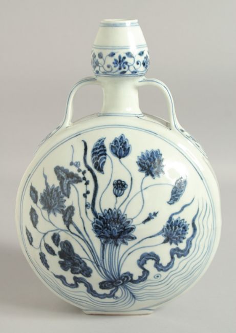 A CHINESE BLUE AND WHITE TWIN HANDLE MOON FLASK, with central floral spray, 30cm high.