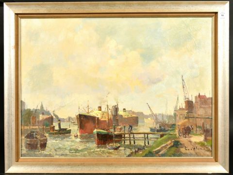 Early 20th Century Continental School, ships and barges on a busy city river with a horse and cart, oil on canvas, indistinctly signed, 19.75" x 27.5", (50 x 70cm).