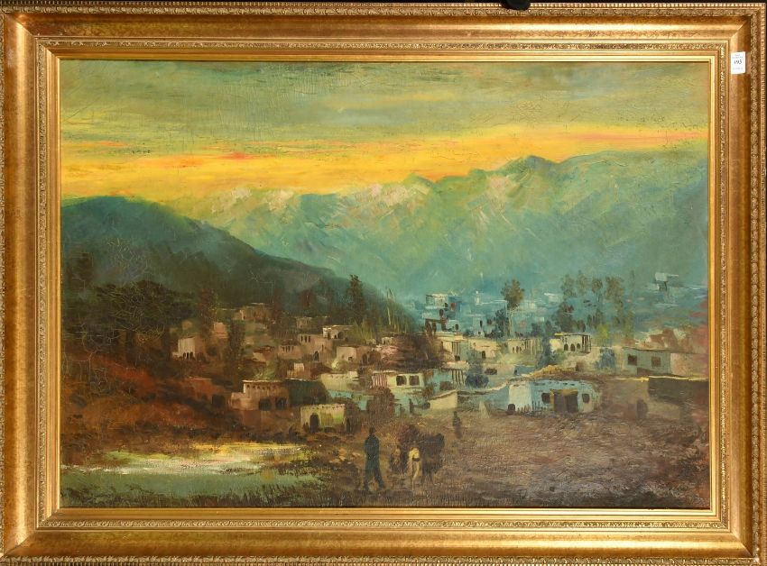 Figures approaching dwellings at dusk in an African or possibly Kashmir landscape, oil on canvas, indistinctly signed, 27.5" x 39.5", (70x100cm).