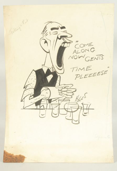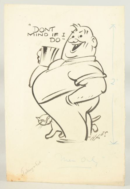 Edward Sylvester Hynes (1897-1982) Irish, 'Don't mind if I do', a man holding a drink with a cat alongside, 13.25" x 8.75", (33.5x22.5cm), along with 'Come along now gents, time pleeeese', 13.25" x 9", (33.5x22.5cm), both pen and ink, signed and inscribed, (unframed) (2).