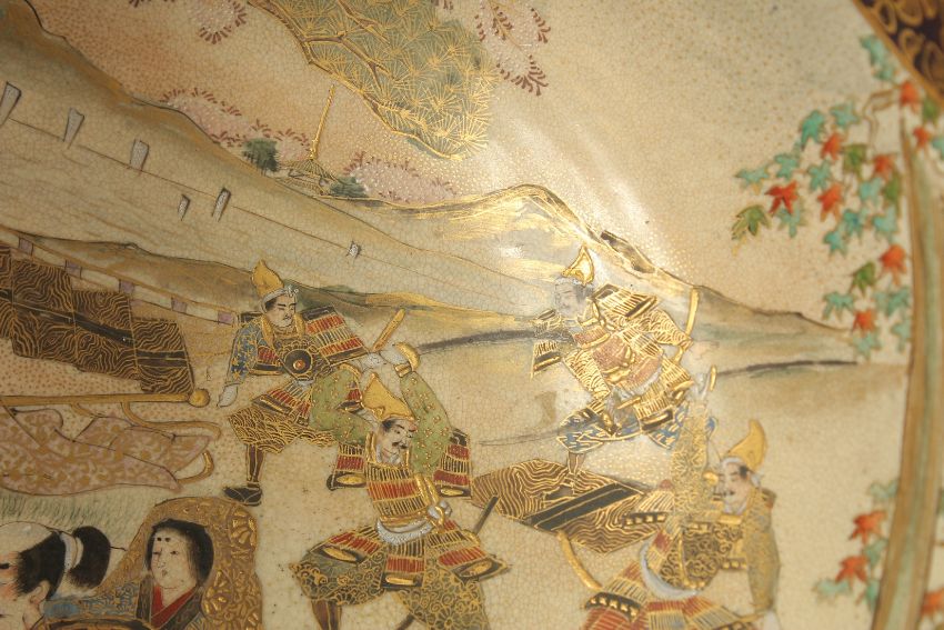 A FINE LATE 19TH CENTURY JAPANESE MEIJI PERIOD SATSUMA BOWL, the interior depicting a landscape scene with samurai, the exterior painted with panels of female figures and native flora, the bowl further embellished with gilt floral motifs and highlights, the base with character mark, 31cm diameter.