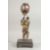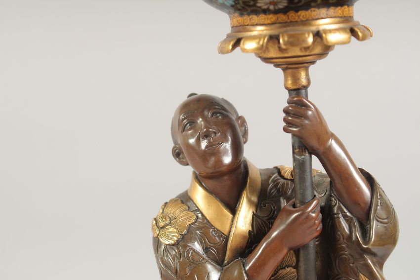 A FINE JAPANESE MEIJI PERIOD BRONZE OKIMONO holding a cloisonne urn aloft, the figure with gilt overlaid robe, mounted to a rectangular bronze base, 41cm high.