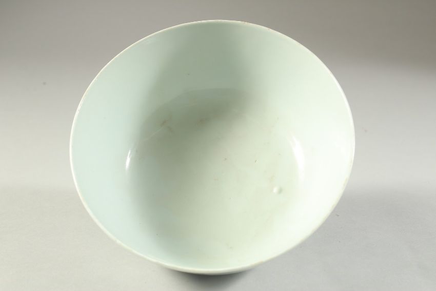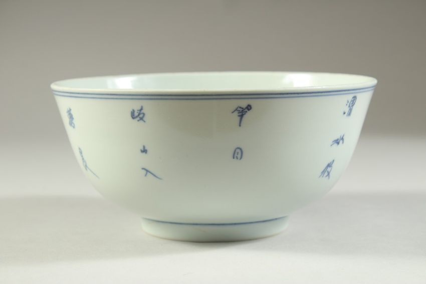 AN EARLY 20TH CENTURY CHINESE BLUE AND WHITE PORCELAIN BOWL, painted with a figure in a landscape, 18cm diameter.