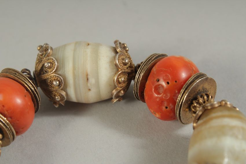 A MIDDLE EASTERN BRACELET CONTAINING ANCIENT AGATE BEADS AND LARGE CORAL BEADS.