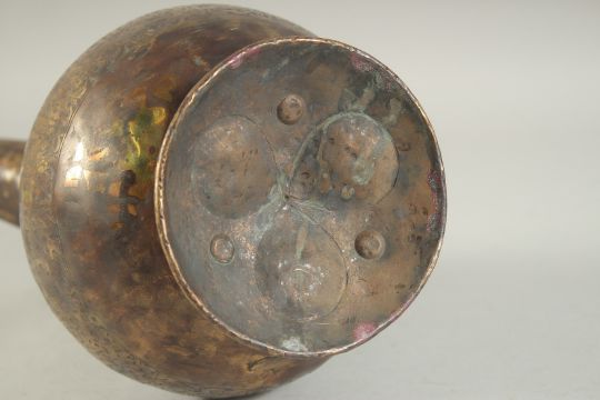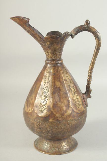 AN ENGRAVED SELJUK STYLE BRASS EWER, with bands of calligraphy, 34.5cm high.