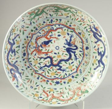 A LARGE CHINESE DOUCAI PORCELAIN CHARGER, (af), 44cm diameter.