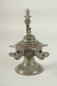 A SEJUK KHORASAN OPENWORKED BRONZE TWIN-SPOUTED OIL LAMP, the handle with bird finial, 25cm long (spout to handle).