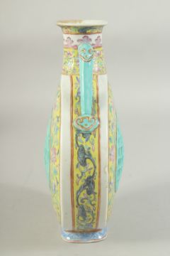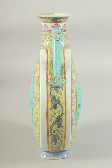 A 19TH CENTURY CHINESE FAMILLE JAUNE PORCELAIN TWIN HANDLE FLASK VASE, with pierced central panel and foliate decoration, the base with six-character mark, 24.5cm high.