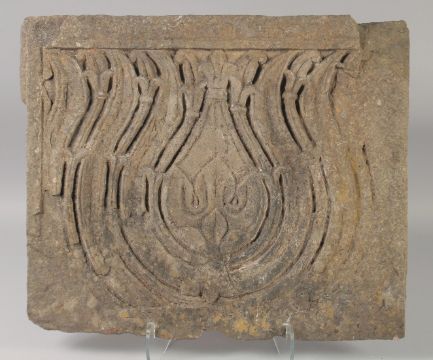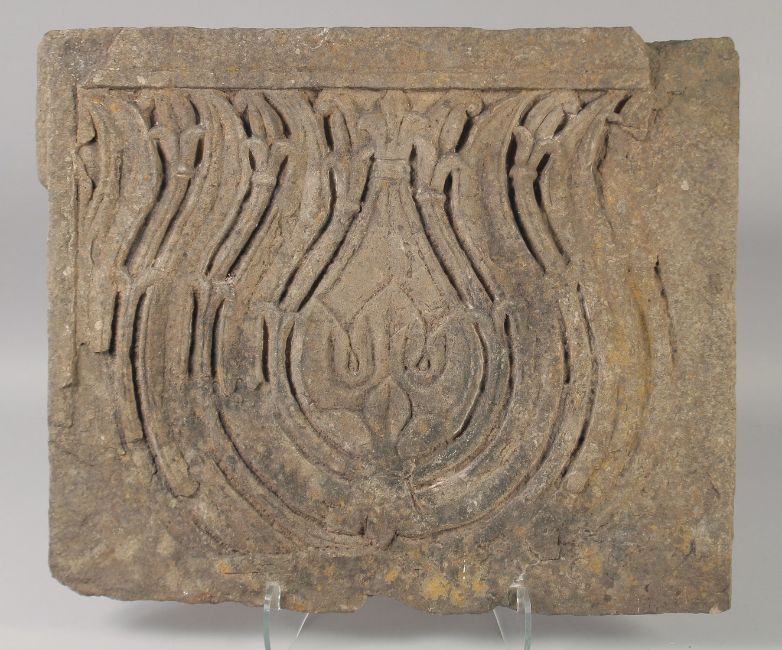 A FINE 17TH CENTURY MUGHAL NORTH INDIAN CARVED STONE PANEL, depicting a lotus flower, 48.5cm x 58cm.