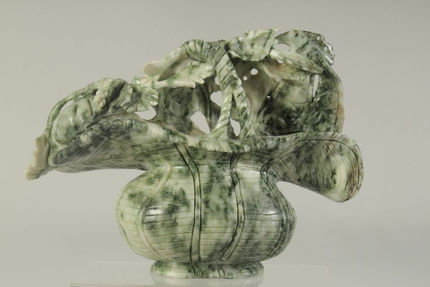 A LARGE CHINESE SOAPSTONE CARVING of a basket of fruit / vegetables, 26cm wide.