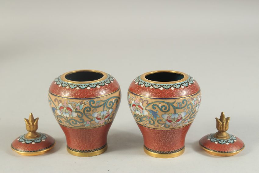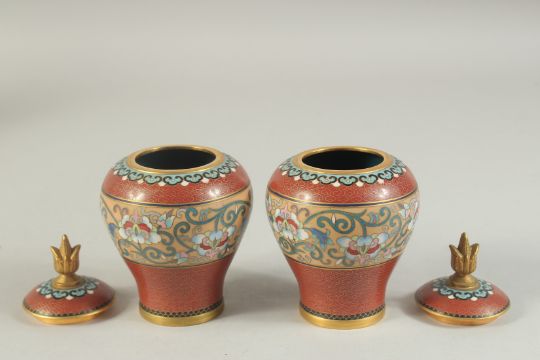A PAIR OF MID 20TH CENTURY CHINESE CLOISONNE LIDDED JARS, each with a central band of foliate decoration, 13cm high.