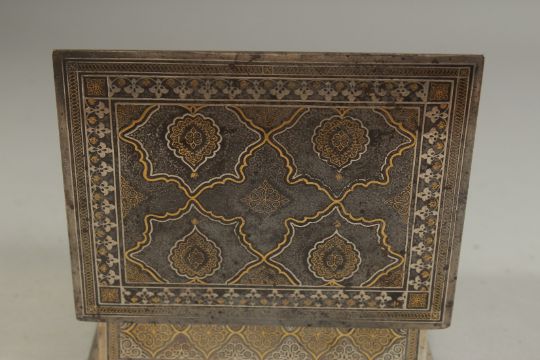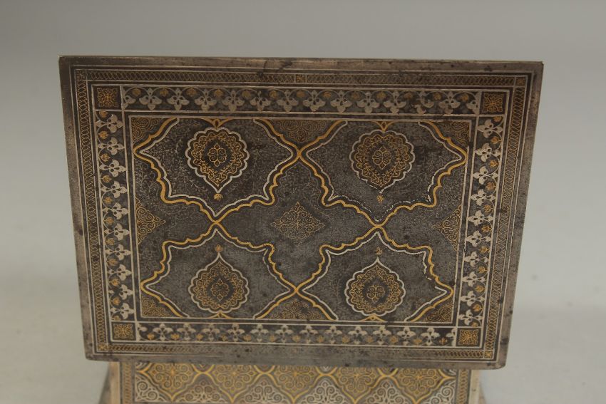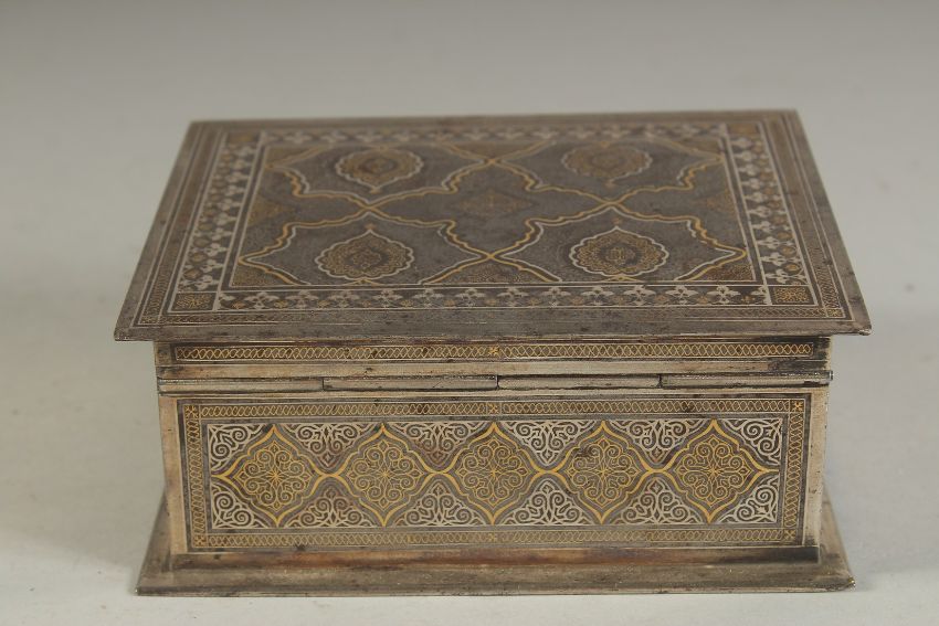A FINE IRANIAN GOLD INLAID METAL BOX, 14cm x 11.5cm.