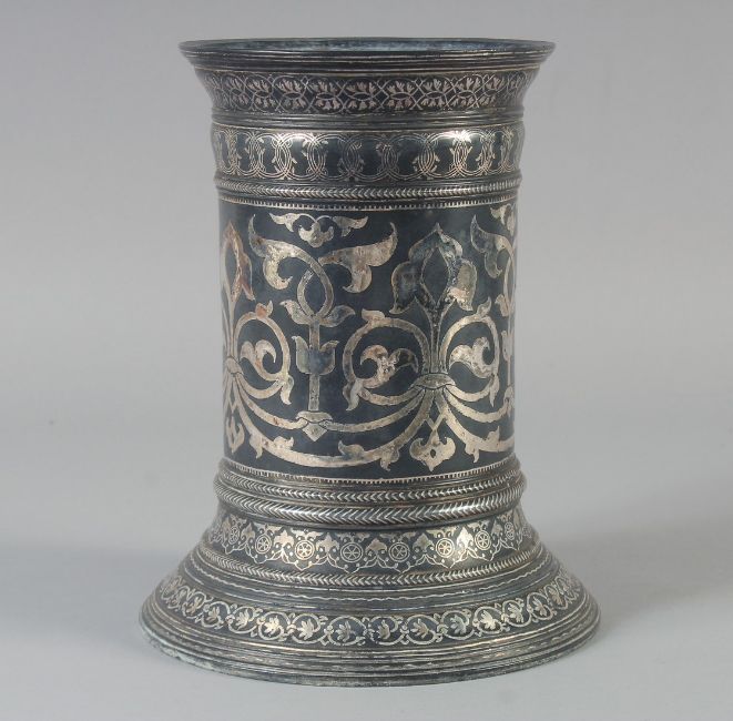 A FINE AND UNUSUAL 18TH-19TH CENTURY LARGE INDIAN BIDRI SILVER INLAID CANDLESTICK / TORCH STAND, 23cm high.