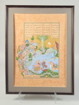 A LARGE FINE PERSIAN MINIATURE PAINTING ATTRIBUTED TO QASIM BIN 'ALI, depicting Rustam kicking the boulder pushed by Bahman, with gilt highlights and panels of calligraphy, framed -unglazed, image 43cm x 31.5cm.