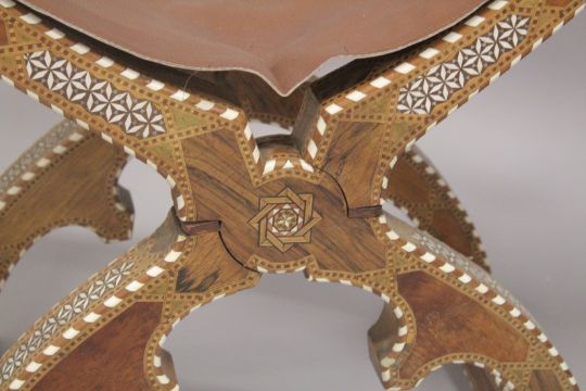 A PAIR OF 19TH CENTURY SPANISH - ISLAMIC MARKET INLAID CHAIRS, with fine parquetry decoration of mixed wood and bone inlay, 71cm wide.