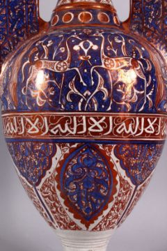 A 19TH CENTURY ISLAMIC SPANISH HISPANO-MORESQUE POTTERY TWIN HANDLE GAZELLE VASE, with a lustre style glaze of birds and bands of calligraphy, 55cm high x 27cm.