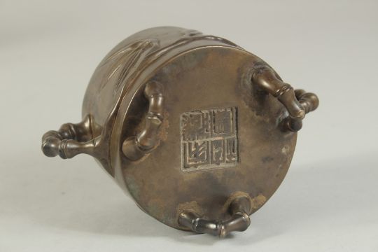 AN 18TH-19TH CENTURY CHINESE BAMBOO DESIGN BRONZE CENSER, with bamboo-form twin handles and raised on similar feet, the base with character mark, 15cm wide (handle to handle).