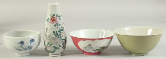 THREE CHINESE PORCELAIN BOWLS, together with a famille rose vase, (4).