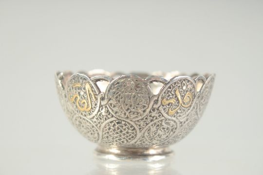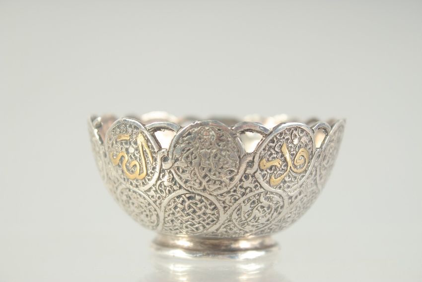 AN INDIAN SILVER PERFUME BOTTLE AND SYRIAN GOLD INLAID SILVER CUP, (2).