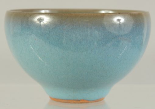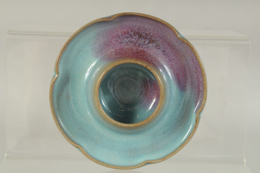 A CHINESE JUN WARE CUP ON PETAL-FORM STAND, cup 8cm diameter, 12cm diameter.