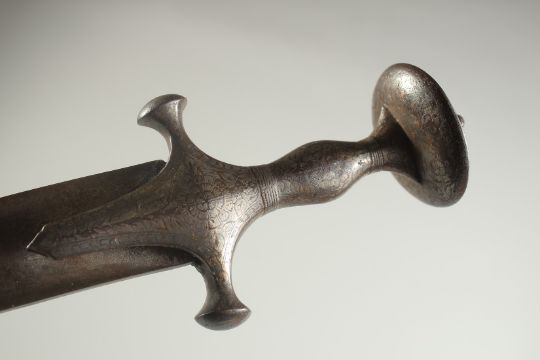 A 19TH CENTURY INDIAN TALWAR SWORD, with silver inlaid handle, 87cm long.