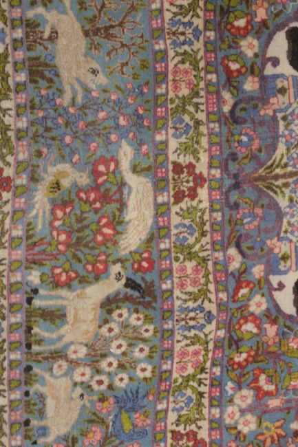 A 20TH CENTURY IRANIAN TABRIZ OR YAZD, densely woven with floral and foliate scrolls, figures and arches, the centre with a depiction of Ahmad Shah Qajar within three bands of Arabic script, the border with flora and fauna, each corner with a pair of snarling lions, 290cm x 173cm.