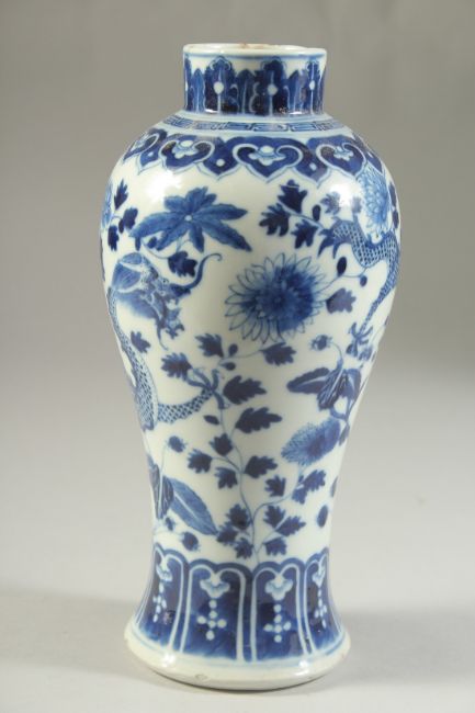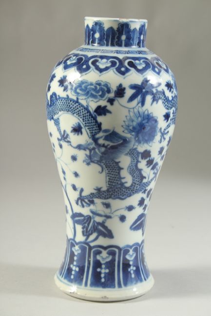 A 19TH CENTURY CHINESE BLUE AND WHITE PORCELAIN DRAGON VASE, character mark to base, (af), 23cm high.