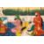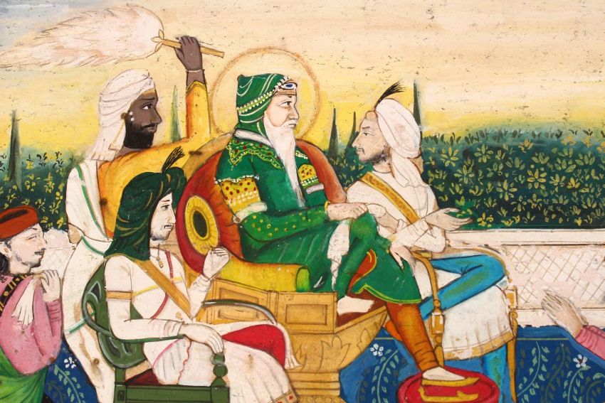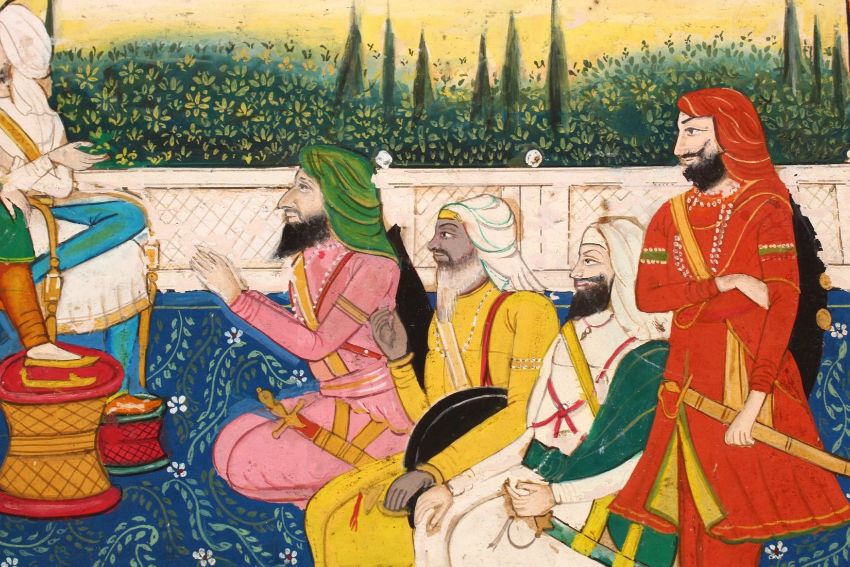 A FINE LARGE INDIAN MINIATURE PAINTING OF SIKH MAHARAJA RANJIT SINGH in court with attendants, 31cm x 25cm.