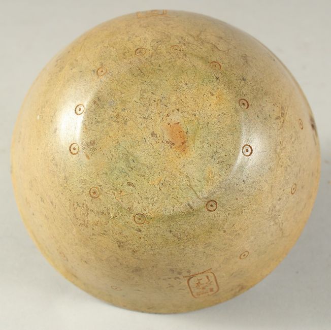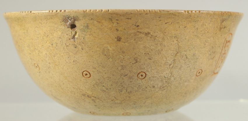 AN UNUSUAL EGYPTIAN STONE BOWL, with fine carvings to the exterior and centre interior, 13.5cm diameter.