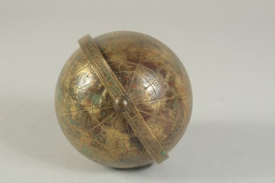 A RARE 19TH-20TH CENTURY INDIAN ENGRAVED BRASS GLOBE, 12.5cm.