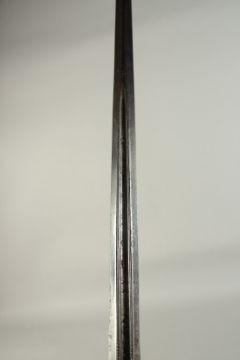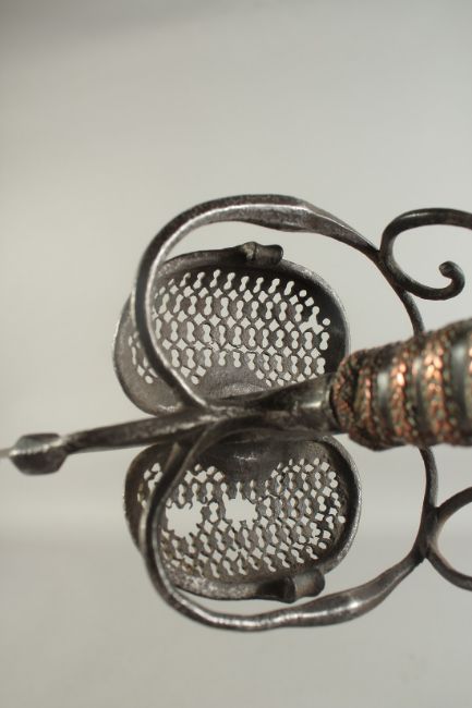AN ENGLISH RAPIER, slender 35in diamond section blade with single fuller indistinctly stamped. Hilt comprising of a pair of Walloon style pierced shells, surrounded by two horizontal rings, 'S' shaped quillons with globular terminals, triple bar knuckle bow screwed to fluted pommel, twisted brass ribbon & twisted wire grip with Turk's heads. Circa 1620.