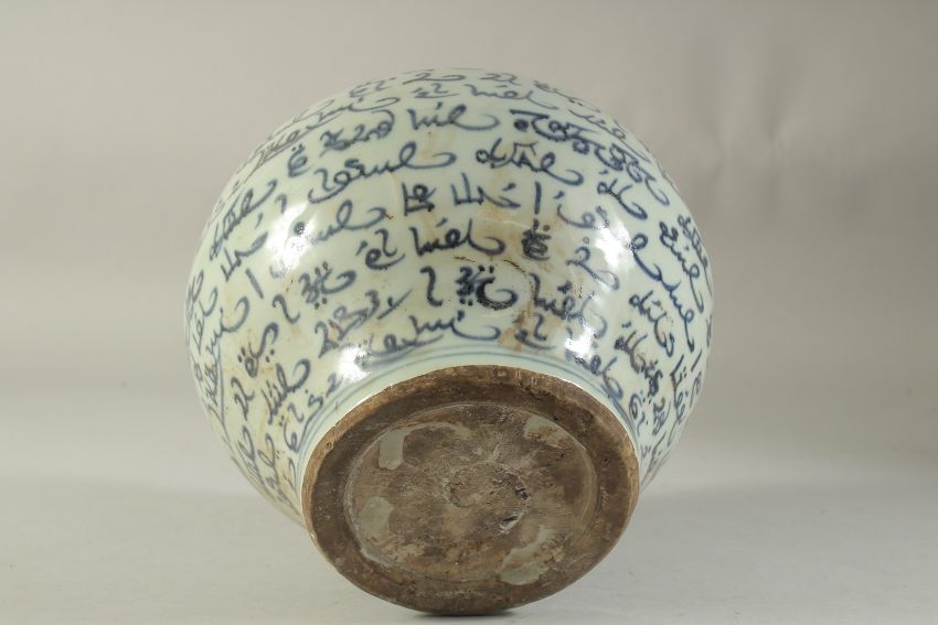 A CHINESE PORCELAIN BLUE AND WHITE ARABIC VASE.
