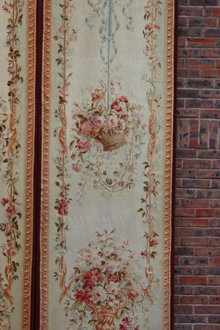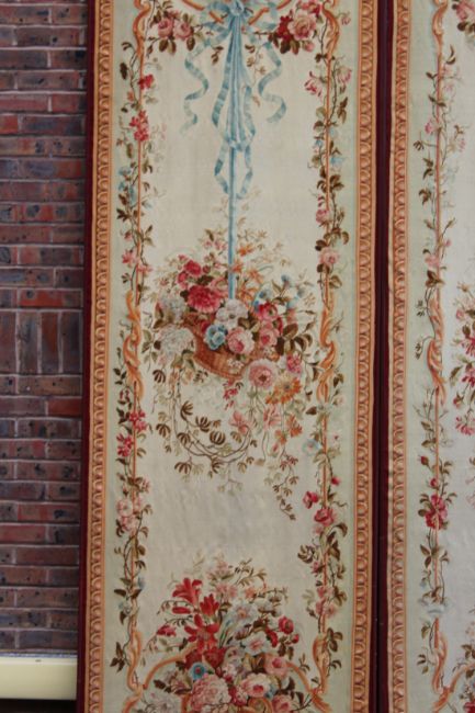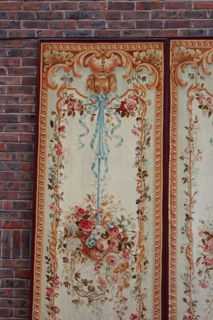 A GOOD PAIR OF LARGE EARLY/MID 20TH CENTURY BRUSSELS NEEDLEWORK PANELS, cream ground, decoration with a flower filled basket suspended from a ribbon and bow, above a flower filled urn on a classical shell base, within an egg and dart border, mounted on a framed backing board.