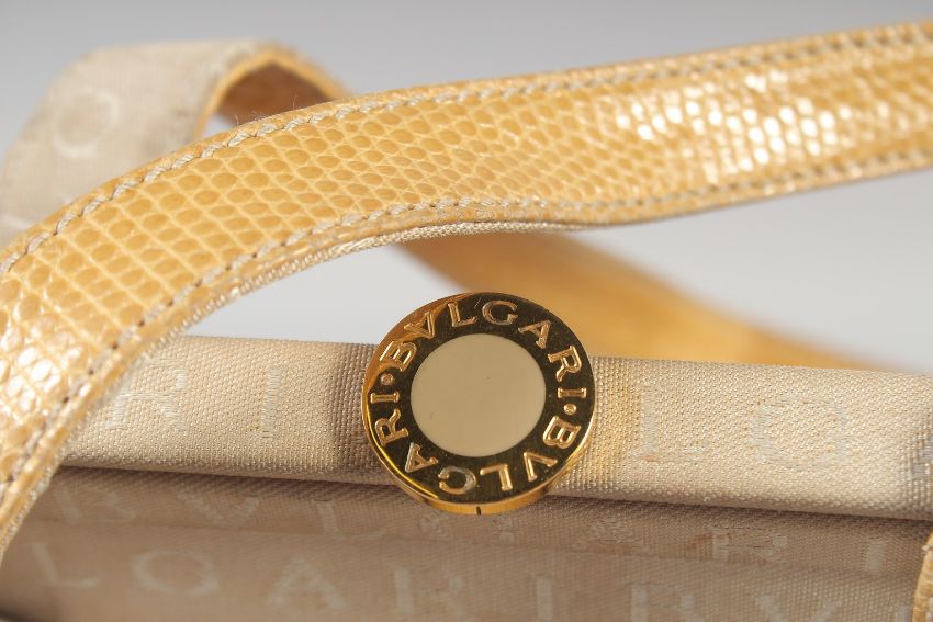 A GOOD BULGARI CREAM PART LEATHER BAG, two shades, two purses at the front.