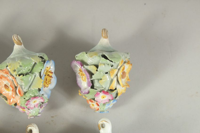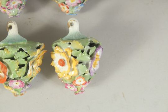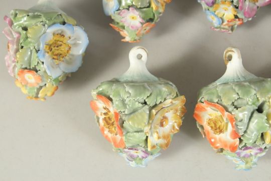 A GOOD SET OF NINE MEISSEN PORCELAIN FLOWER ENCRUSTED TREE DECORATIONS.