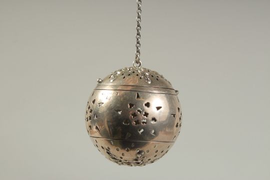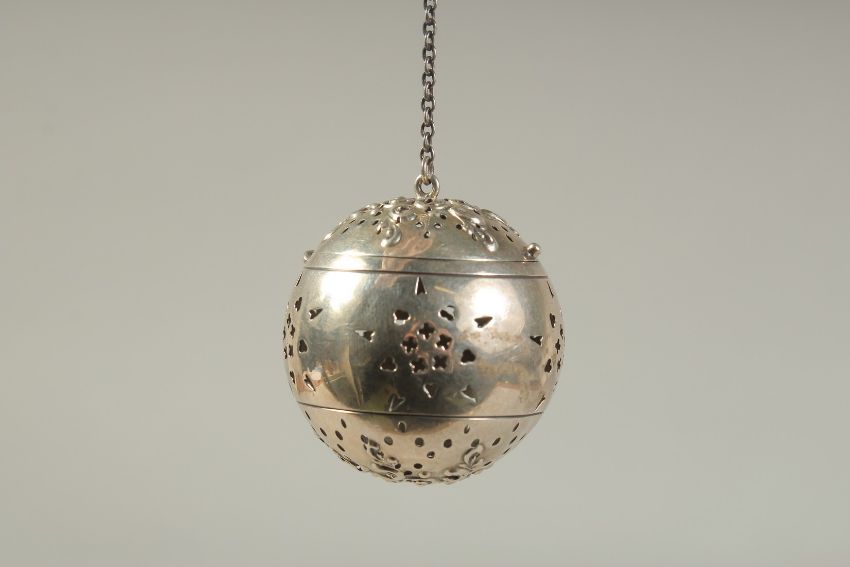 A SILVER GLOBULAR TEA INFUSER on a chain.