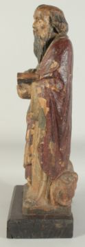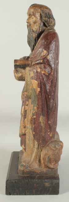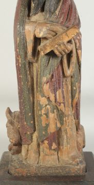 A GOOD 17TH CENTURY CARVED WOOD AND POLYCHROME FIGURE, ST. LUC, on a wooden base.