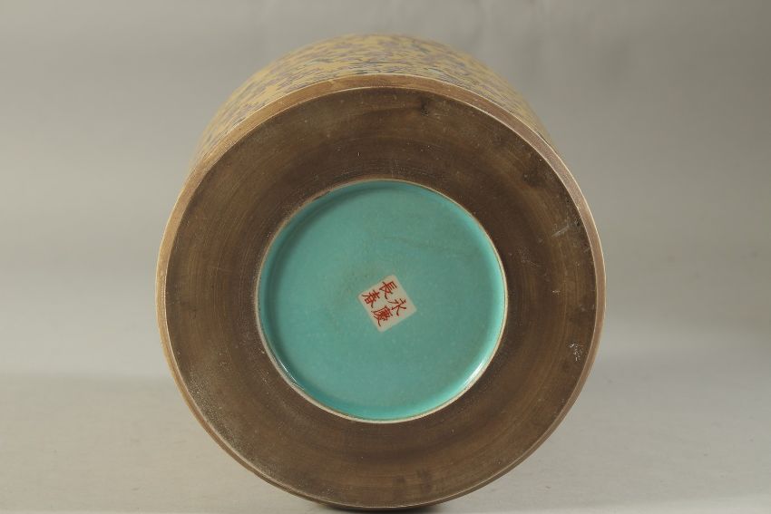A CHINESE PORCELAIN YELLOW GROUND BRUSH POT with birds and flowers.