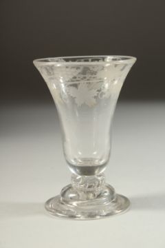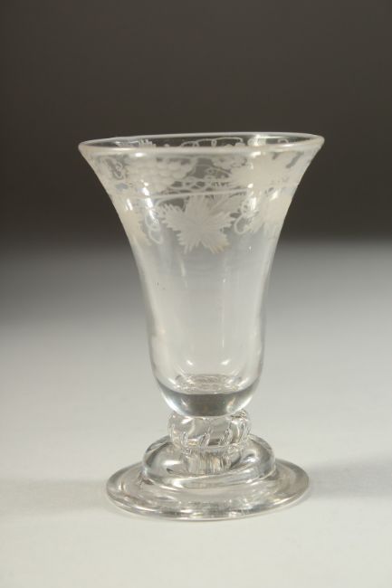 A GOOD SMALL 18TH CENTURY WINE GLASS with inverted bell bowl engraved with fruiting vines.
