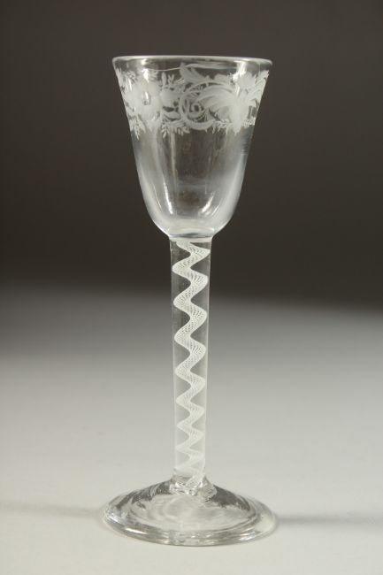 AN 18TH CENTURY ENGLISH WINE the bowl with roses and scrolls with white twist stem.