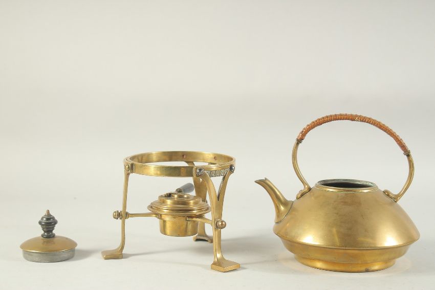 A GOOD BRASS CIRCULAR KETTLE on a stand with spirit burner, possibly CHRISTOPHER DRESSER.