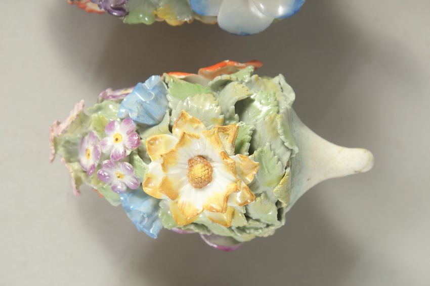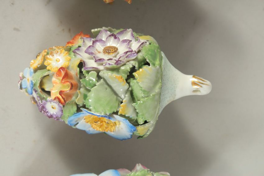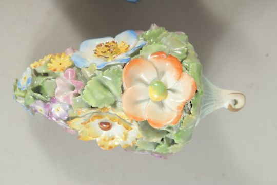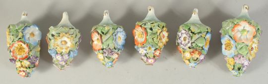 A LARGE PAIR OF MEISSEN PORCELAIN FLOWER ENCRUSTED TREE DECORATIONS, 4.5ins long, and four small tree decorations, 3.75ins long (6).
