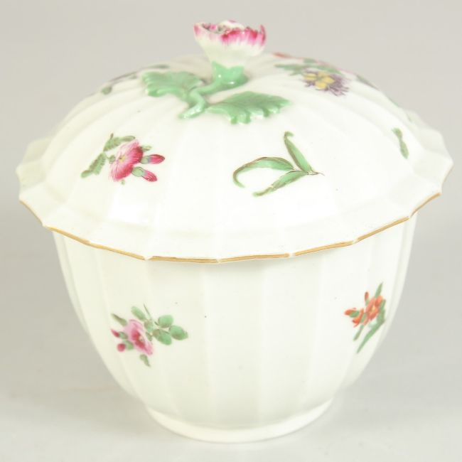 A GOOD 1ST PERIOD WORCESTER PORCELAIN CIRCULAR BOWL AND COVER painted with flowers with flower knop.